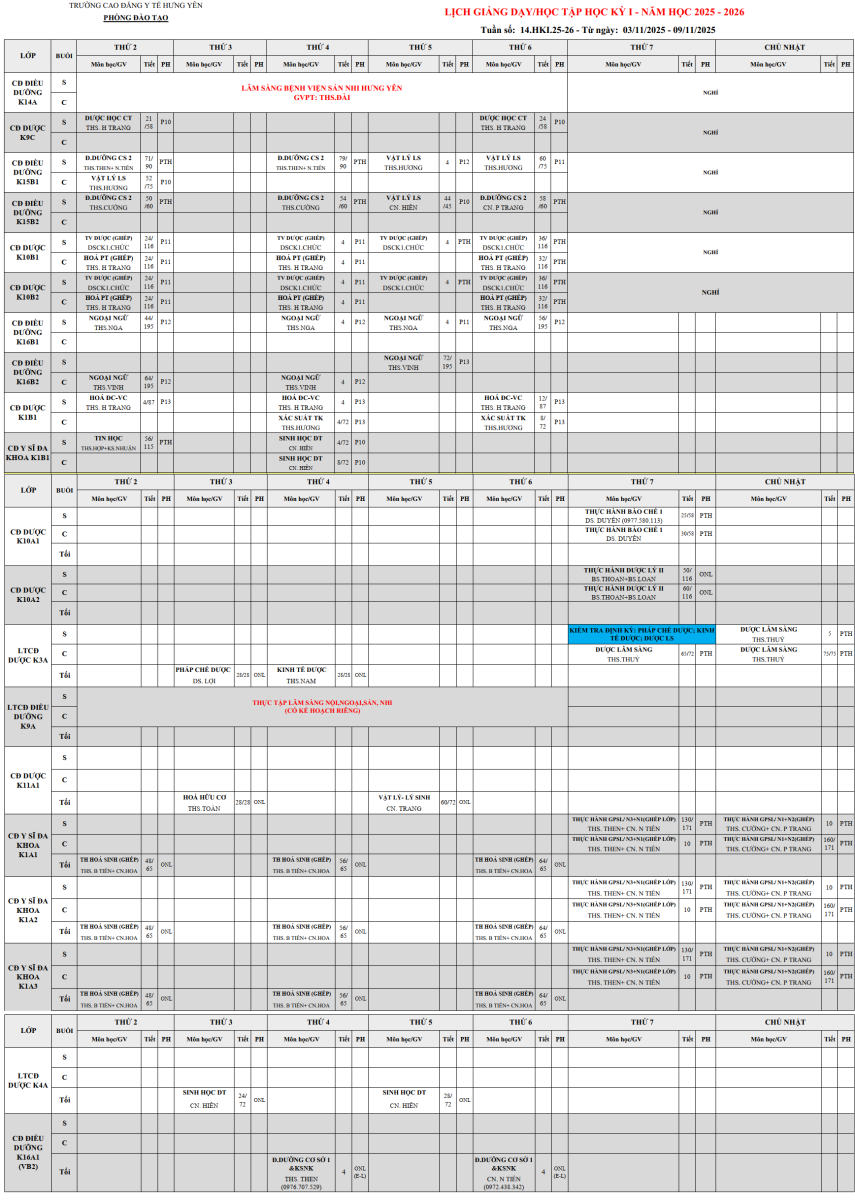 Trường CĐ Y tế Hưng Yên thông báo Lịch giảng dạy và lịch học toàn trường, tuần thứ 14, học kỳ 1, năm học 2025-2026