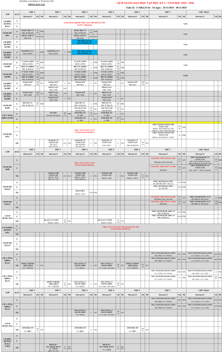 Trường CĐ Y tế Hưng Yên thông báo Lịch giảng dạy và lịch học toàn trường, tuần thứ 17, học kỳ 1, năm học 2025-2026