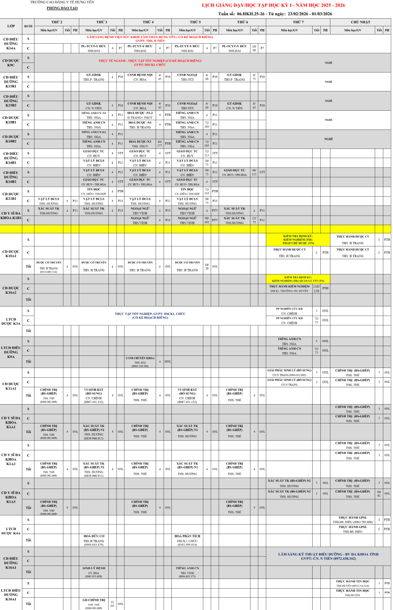 Trường CĐ Y tế Hưng Yên thông báo Lịch giảng dạy và lịch học toàn trường, tuần thứ 6, học kỳ 2, năm học 2025-2026