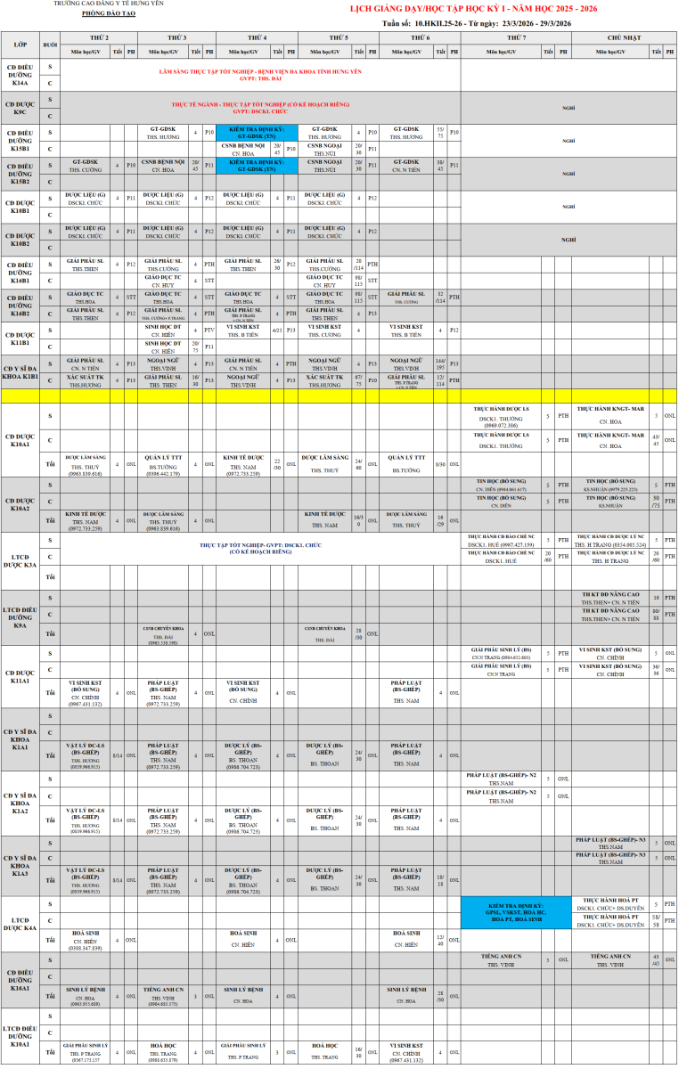 Trường CĐ Y tế Hưng Yên thông báo Lịch giảng dạy và lịch học toàn trường, tuần thứ 10, học kỳ 2, năm học 2025-2026