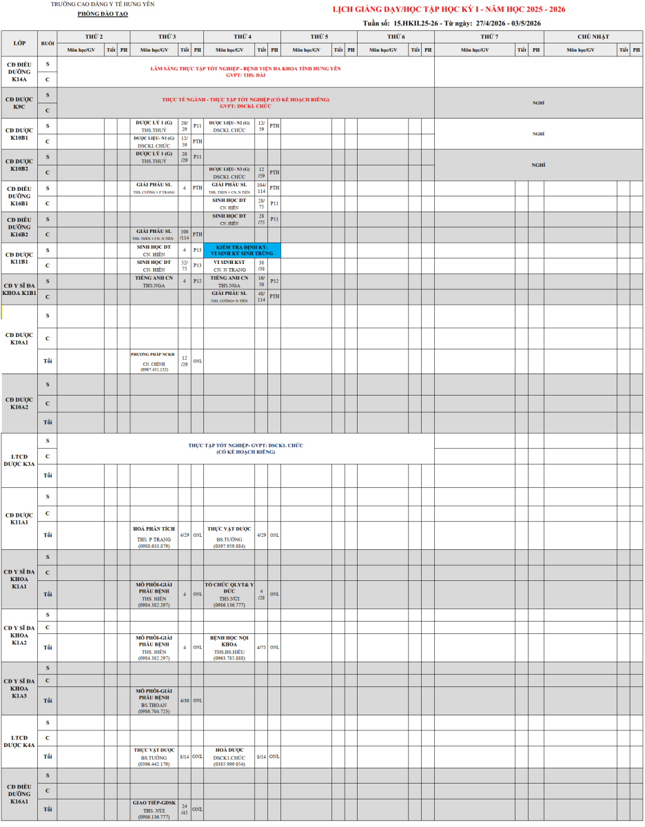 Trường CĐ Y tế Hưng Yên thông báo Lịch giảng dạy và lịch học toàn trường, tuần thứ 15, học kỳ 2, năm học 2025-2026