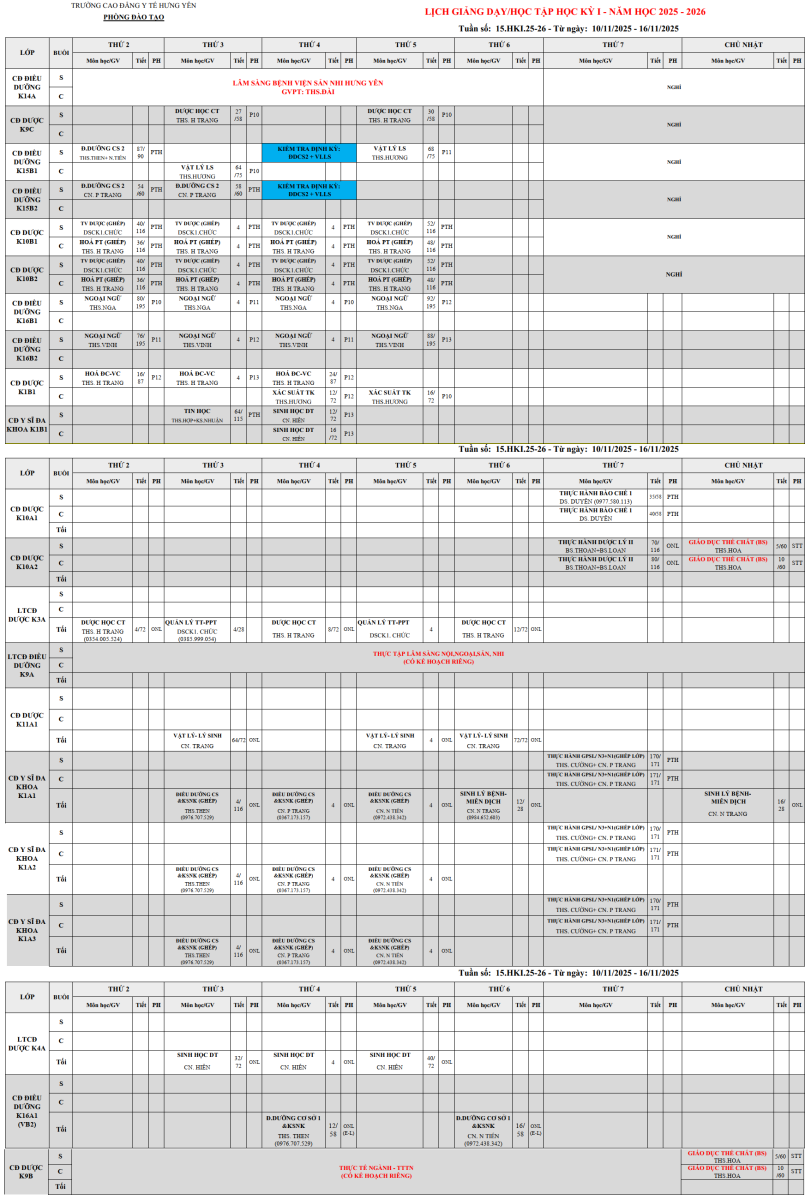 Trường CĐ Y tế Hưng Yên thông báo Lịch giảng dạy và lịch học toàn trường, tuần thứ 15, học kỳ 1, năm học 2025-2026