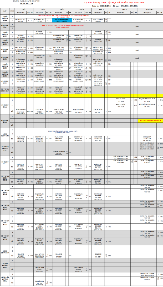 Trường CĐ Y tế Hưng Yên thông báo Lịch giảng dạy và lịch học toàn trường, tuần thứ 8, học kỳ 2, năm học 2025-2026