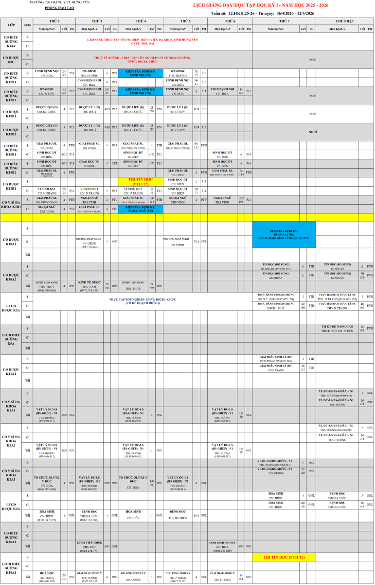 Trường CĐ Y tế Hưng Yên thông báo Lịch giảng dạy và lịch học toàn trường, tuần thứ 12, học kỳ 2, năm học 2025-2026